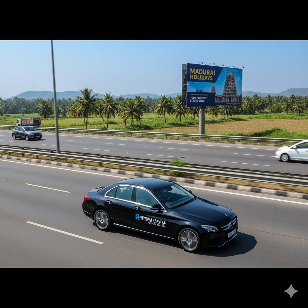 | [Pre-Scheduled Time] | VIP Kerbside Pick-Up in Madurai | Your luxury Sedan and professional chauffeur (trained by RENGHA TRAVELS) arrive promptly at your designated Madurai location. The chauffeur assists with loading luggage securely into the Sedan’s spacious boot. |